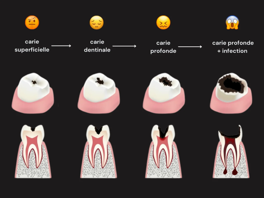 Le traitement d’une carie dentaire consiste à éliminer les tissus dentaires cariés et à obturer la cavité pour restaurer la fonction et l’esthétique de la dent. Selon l’avancement, le dentiste utilise des amalgames (plombages) ou des composites résine (blancs). En cas d’atteinte profonde, une dévitalisation est nécessaire.
